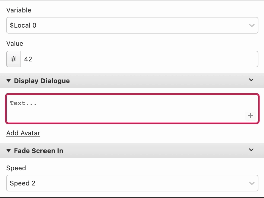 • Font: Adding %f before a variable causes the font to change to an index based on the variable's value. The index of each font in your game is determined by the order the fonts appear in script_engine_init.s which you can find by selecting Game > Advanced > Export Project Data from the application menu.