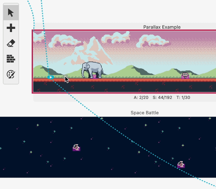 Można również zmienić pozycję startową gracza, przeciągając ikonę  i można nawet przeciągać ją między scenami.